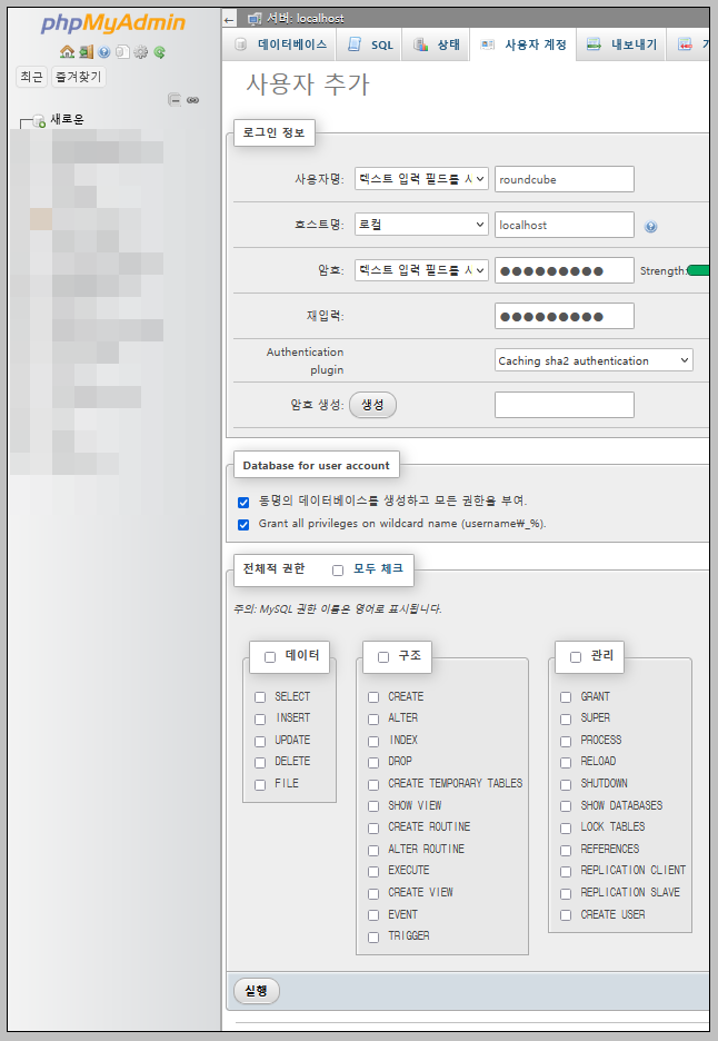 Mysql Roundcube 사용자, DB 생성