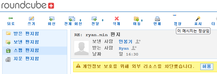 스팸을 해제해보자. 스팸 편지함의 편지를 읽으며 정상을 클릭한다.