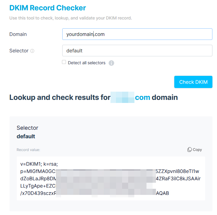 DKIM record checker tool shows your domain DKIM record for a specific selector and helps identify its issues.
