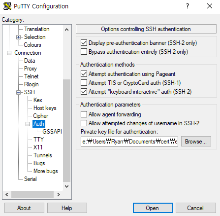 putty 접속시 그냥 여기에 ppk 파일을 선택해 주는 것으로 키설정은 모두 끝난다.