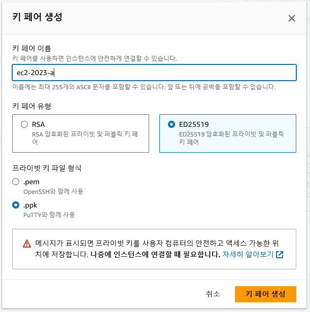 ED25519, ppk 를 선택해야 putty 에서 별다른 설정없이 접속이 된다.
