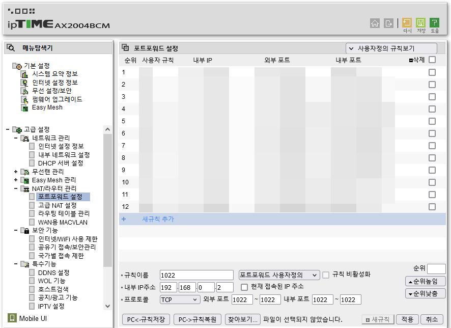 (2) 고급 설정 > NAT/라우터 관리 > 포트포워드 설정